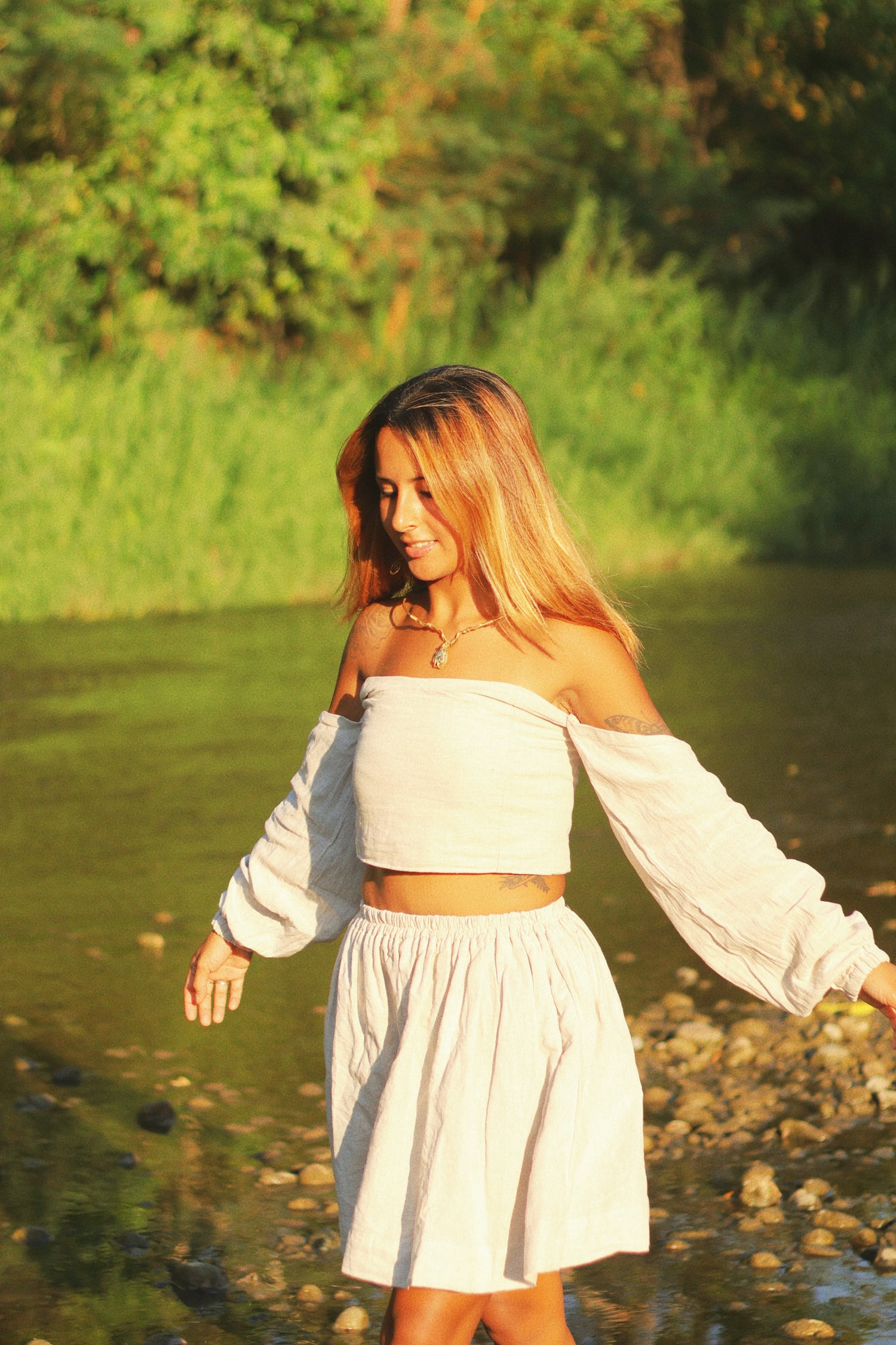 Off-shoulder top. Flowing skirt.